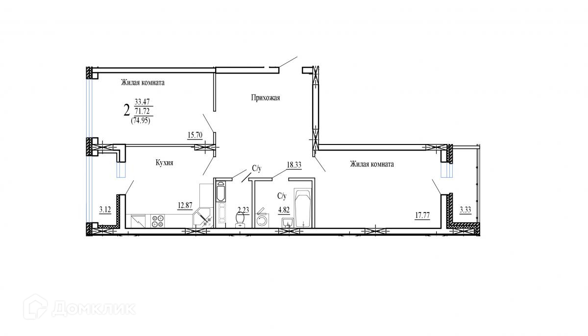 - Общая площадь: 74.95 м²