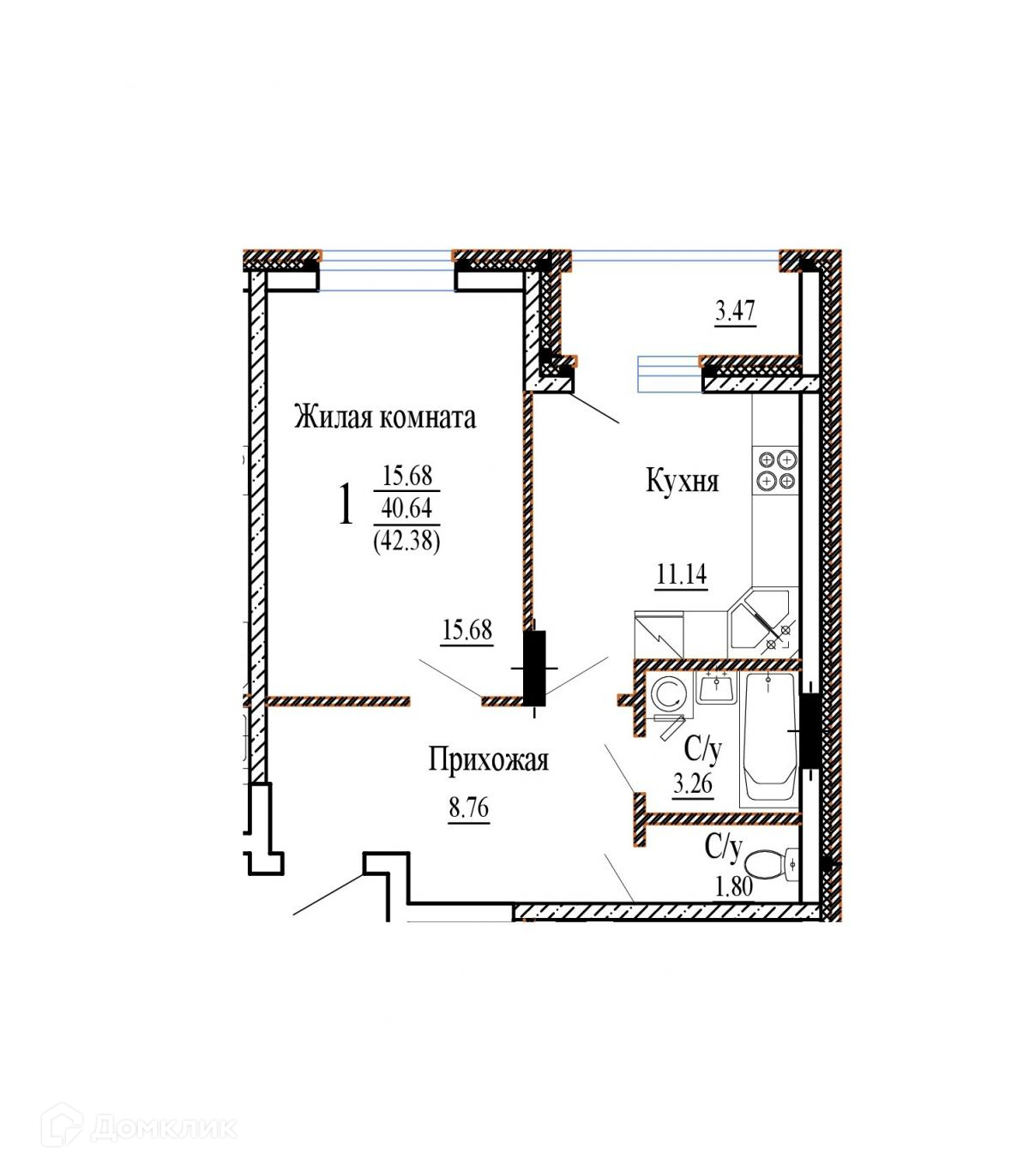 - Общая площадь: 42.38 м²