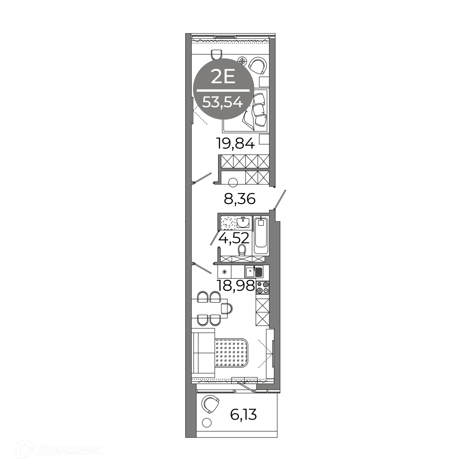 - Общая площадь: 53.54 м²