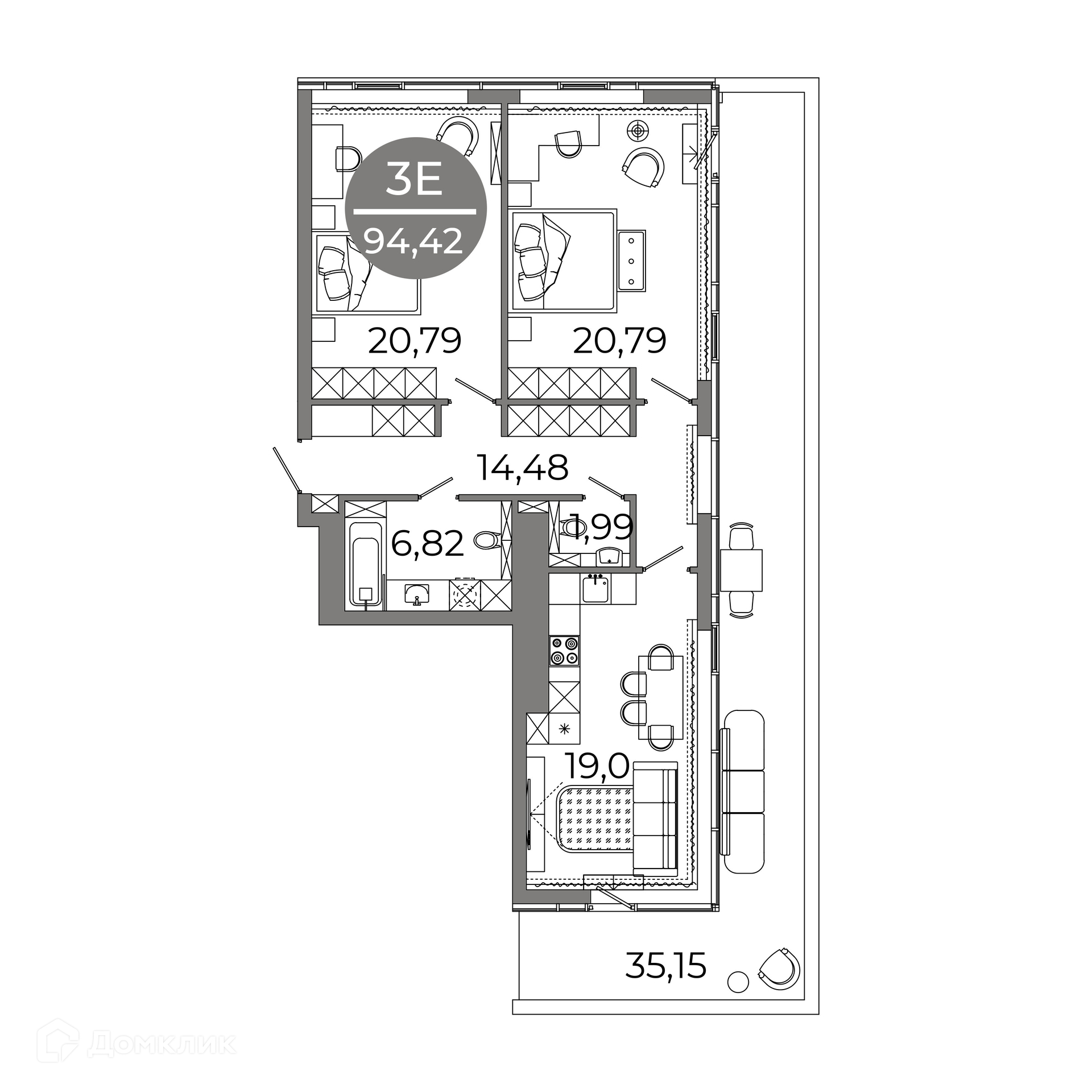 - Общая площадь: 94.42 м²