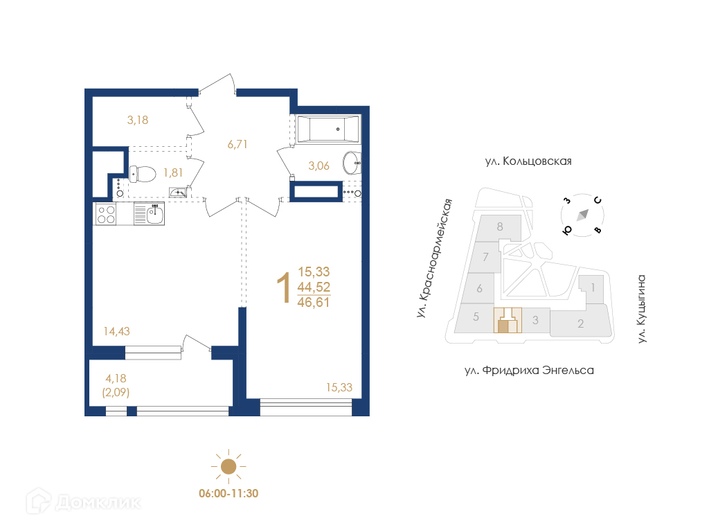 - ✅ Светлая жилая площадь: 15.33 м².