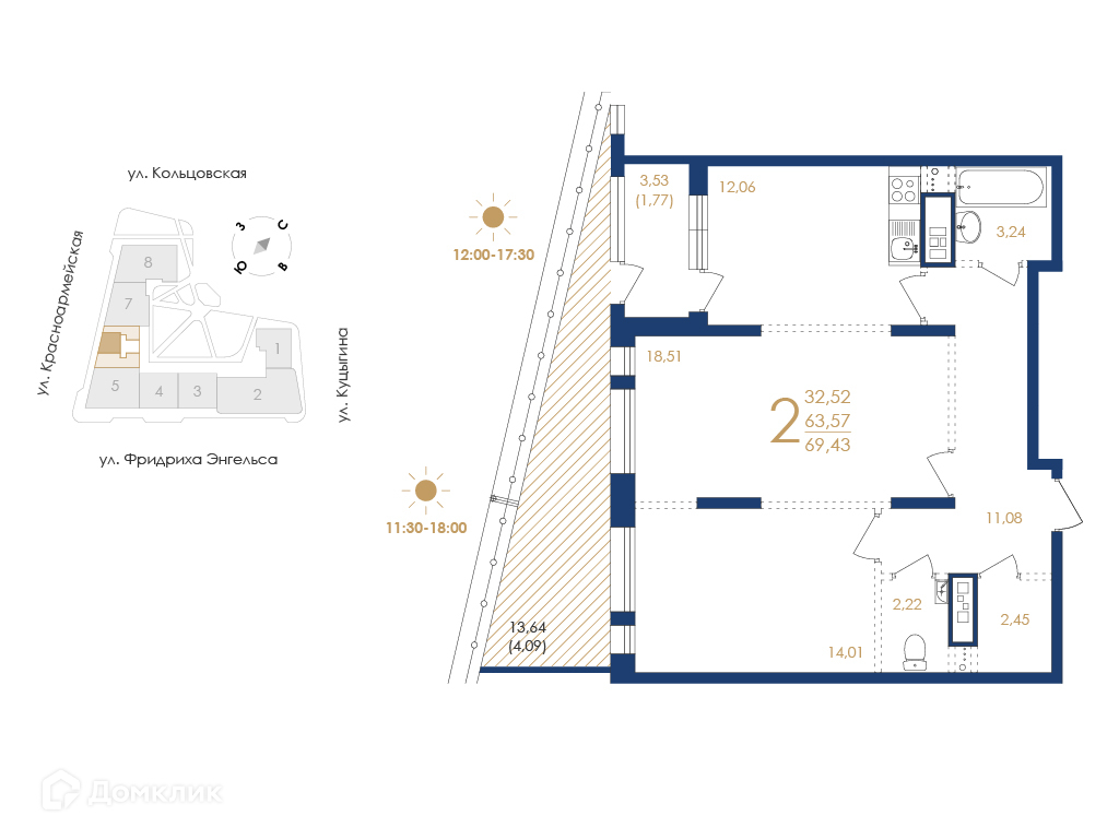 - Общая площадь: 69.43 м²