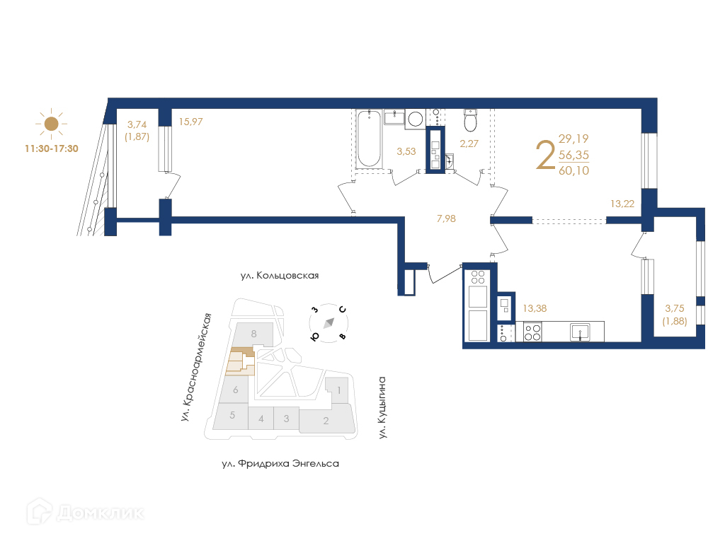- ✅ Кухня: 13.38 м² — эргономичное пространство.
