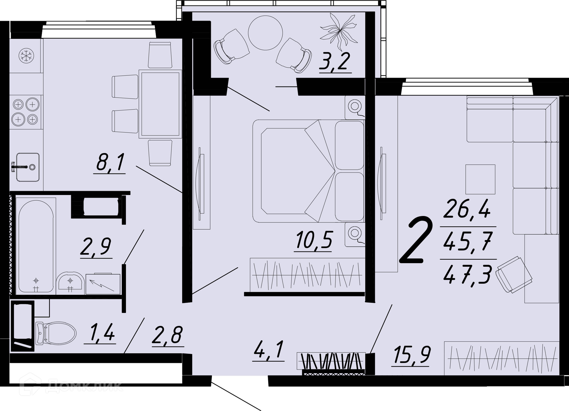 - Общая площадь: 47.1 м²