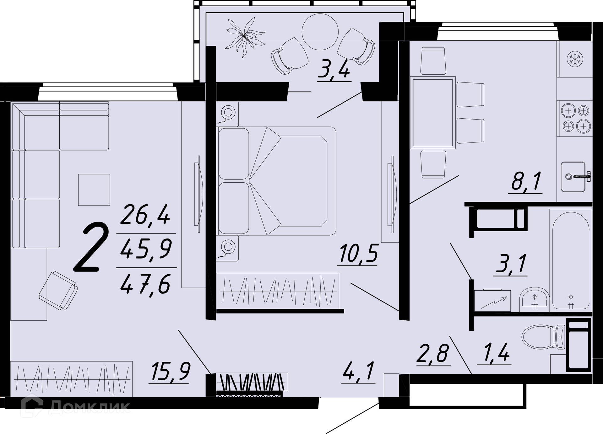 - Общая площадь: 47.3 м²
