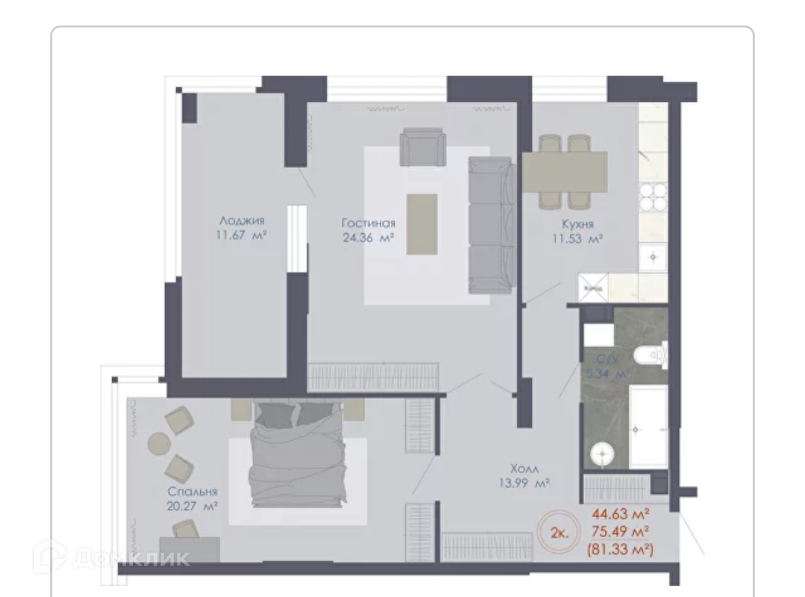 Планировка 2 комн. в ЖК Дом 48