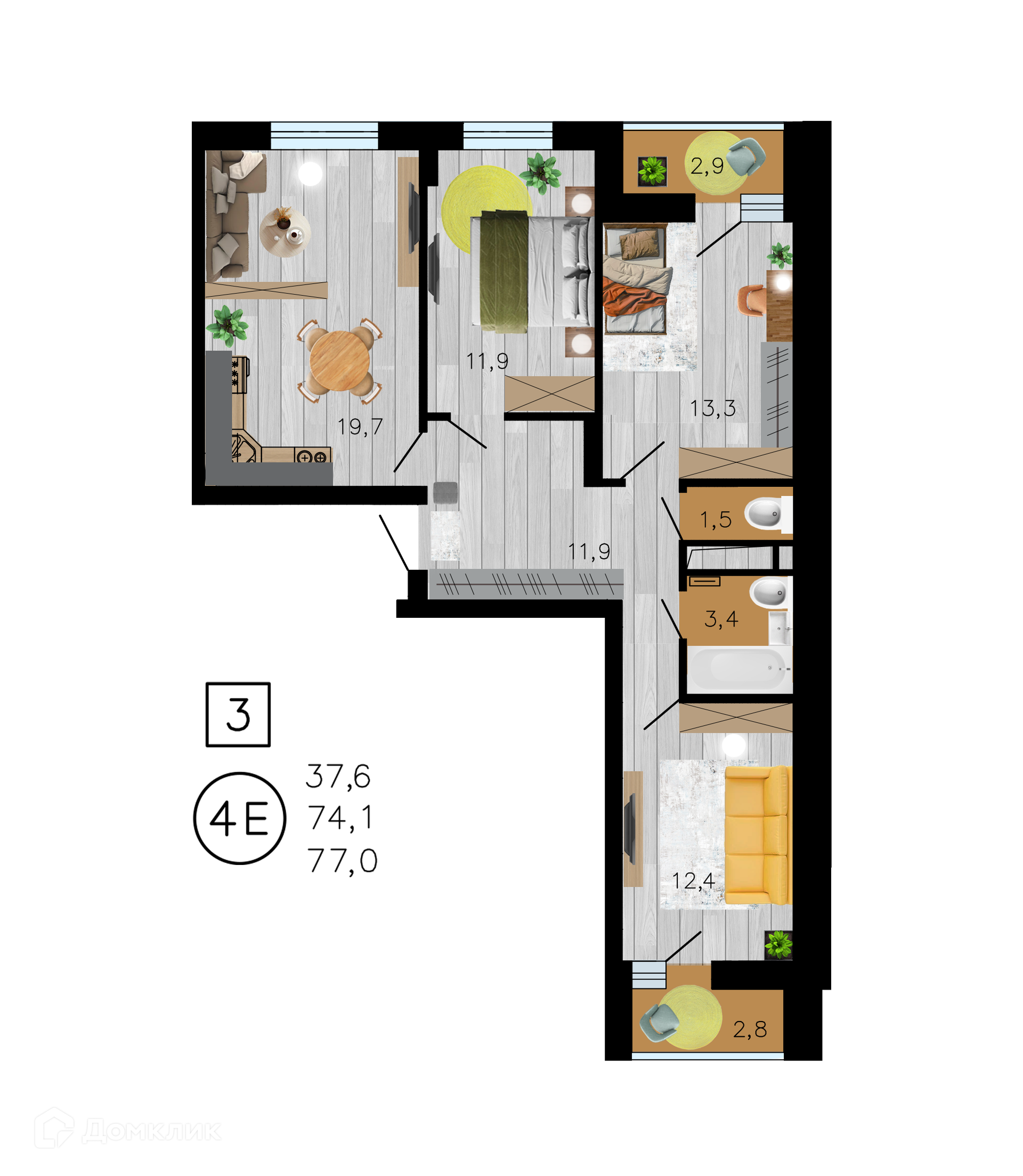 - Общая площадь: 77 м²