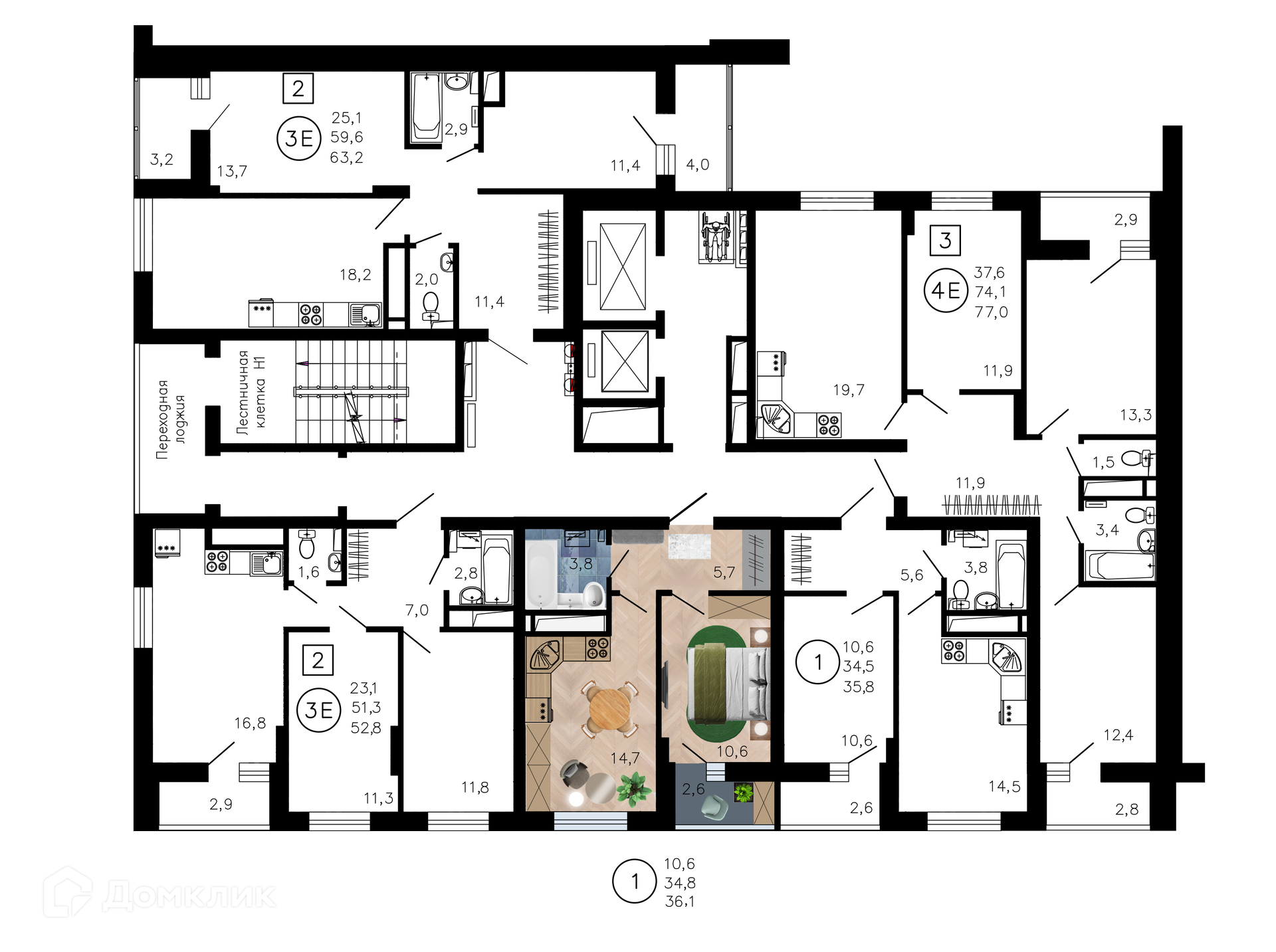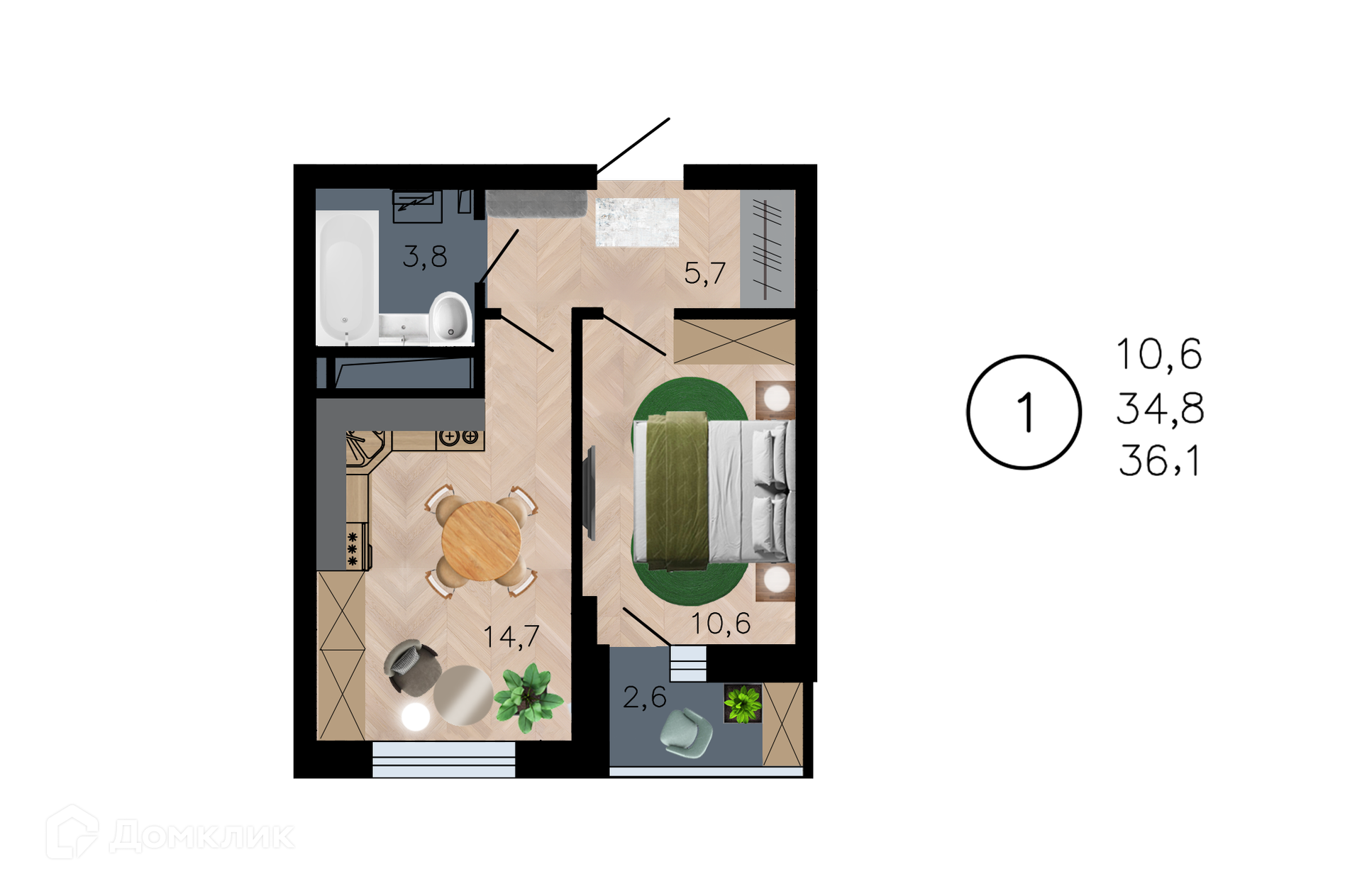 - Общая площадь: 36.1 м²