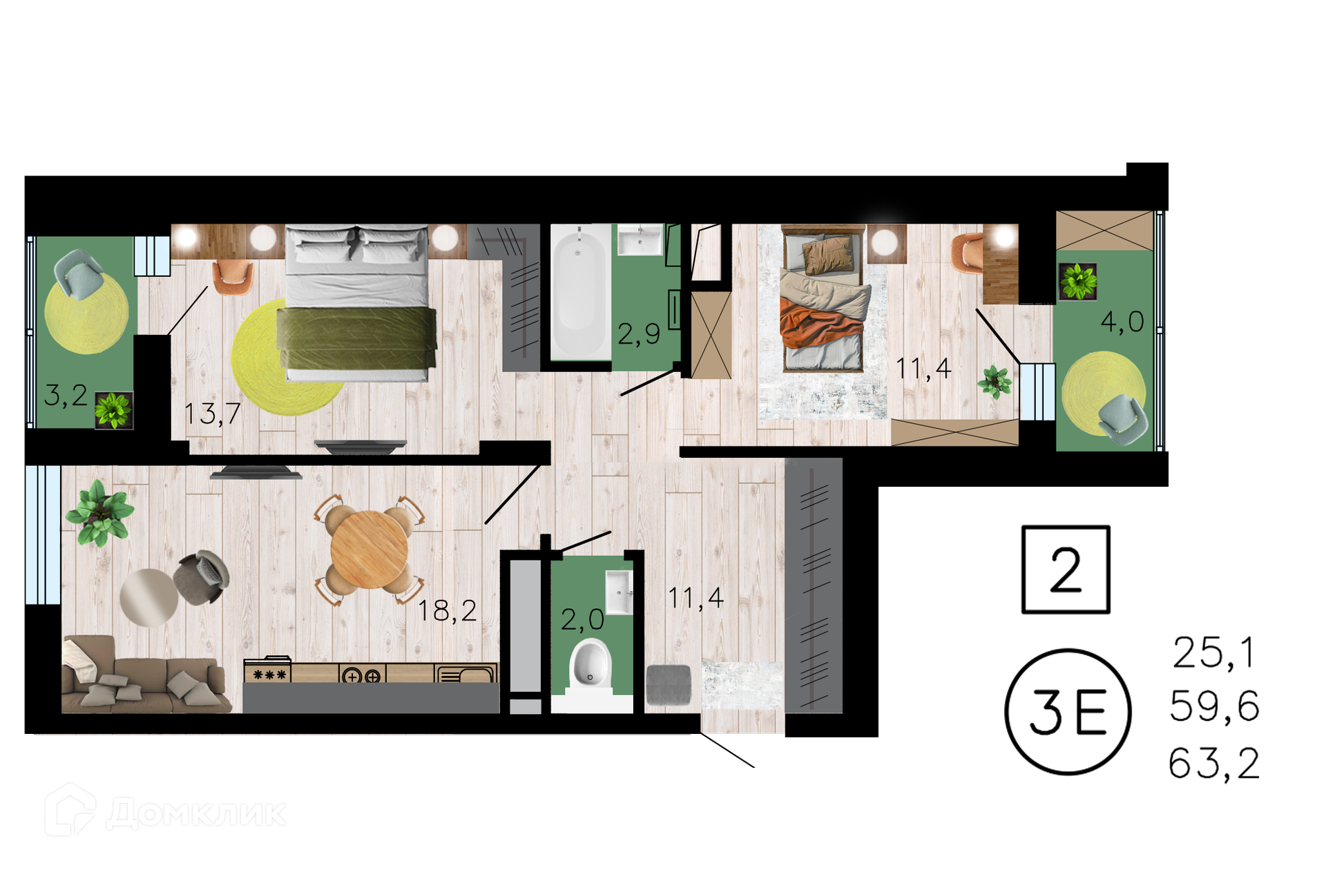 - Общая площадь: 63.2 м²