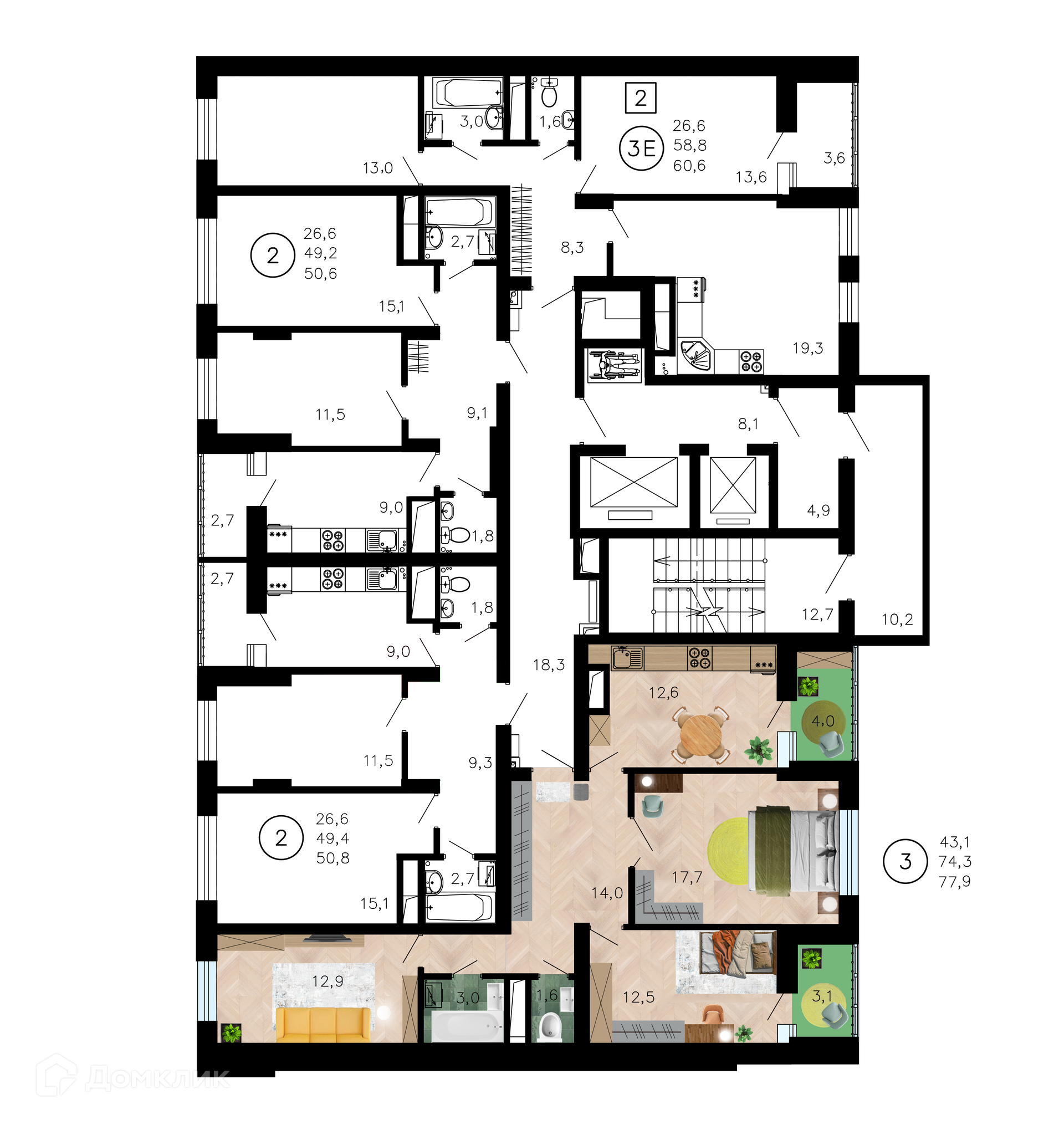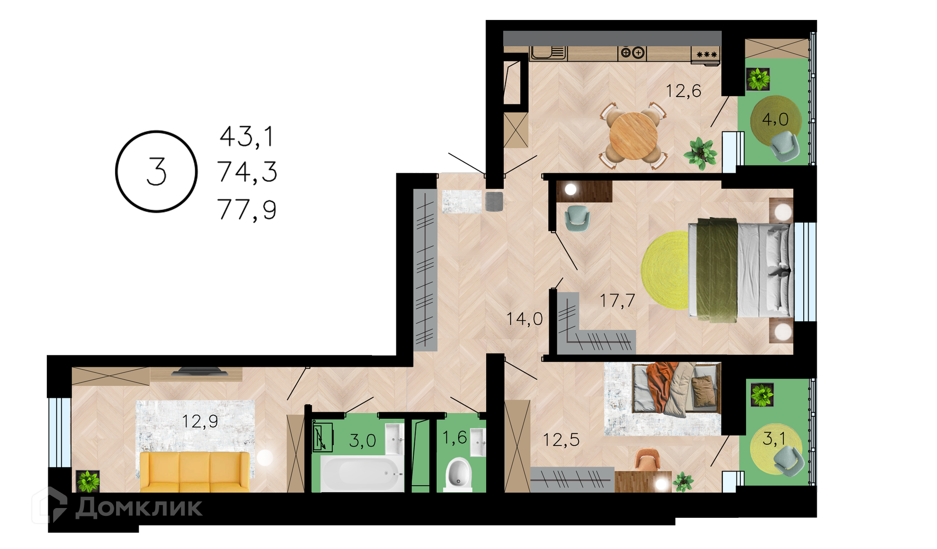 - Общая площадь: 77.9 м²