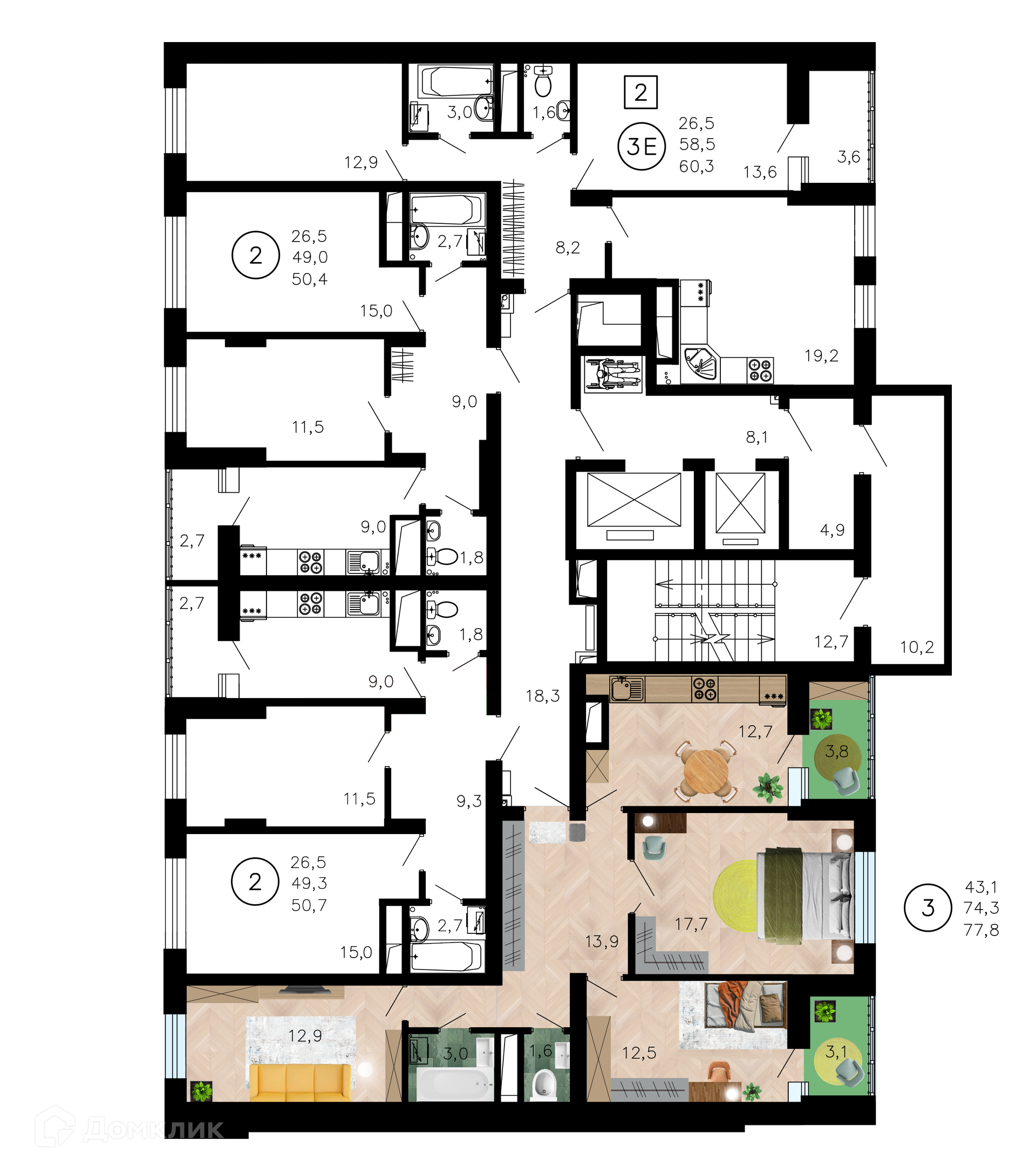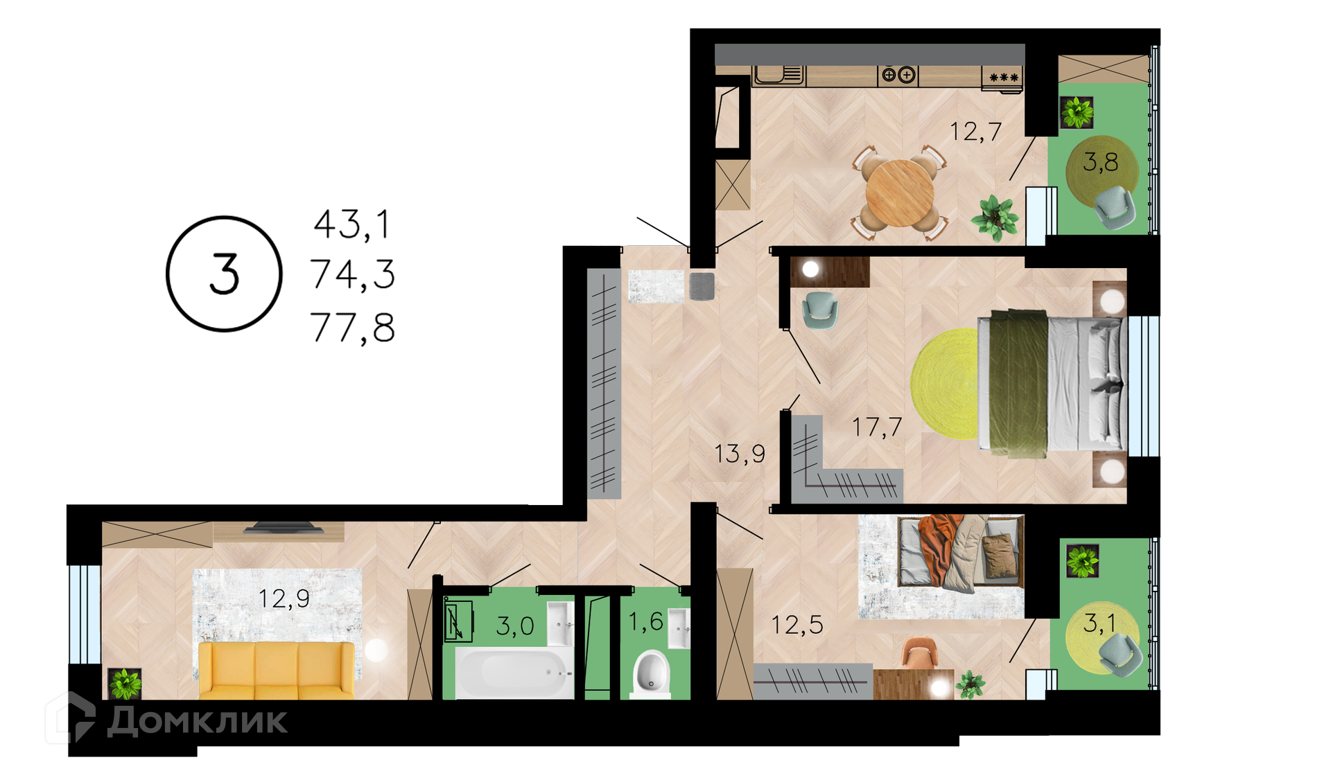 - Общая площадь: 77.8 м²
