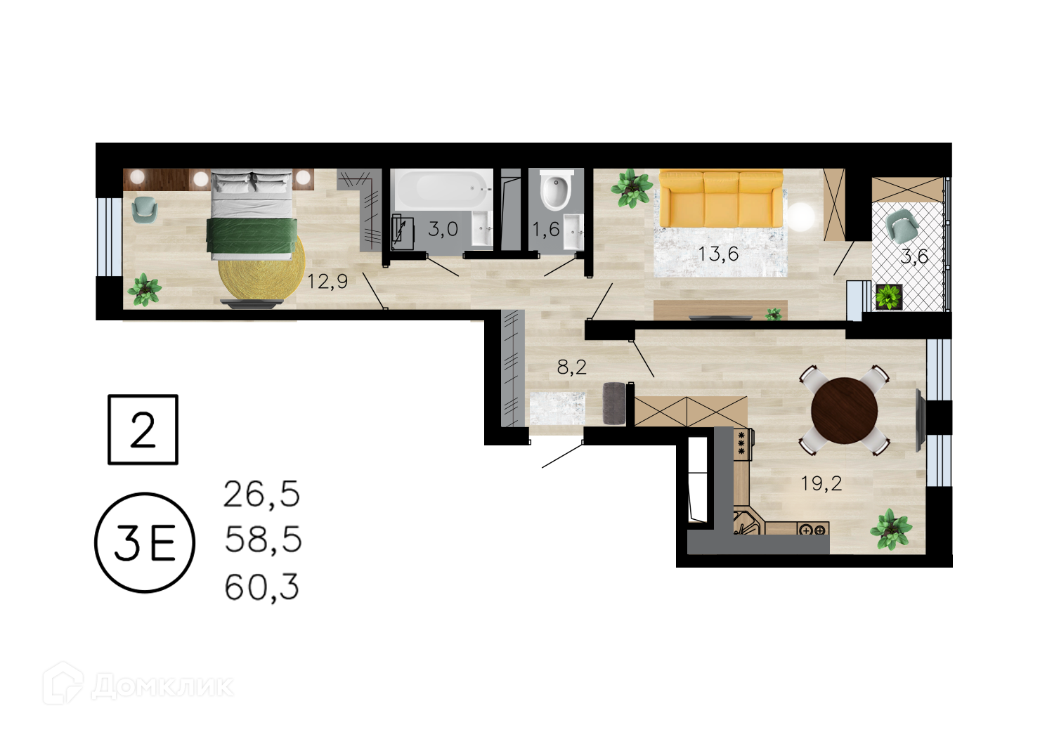 - Общая площадь: 60.3 м²