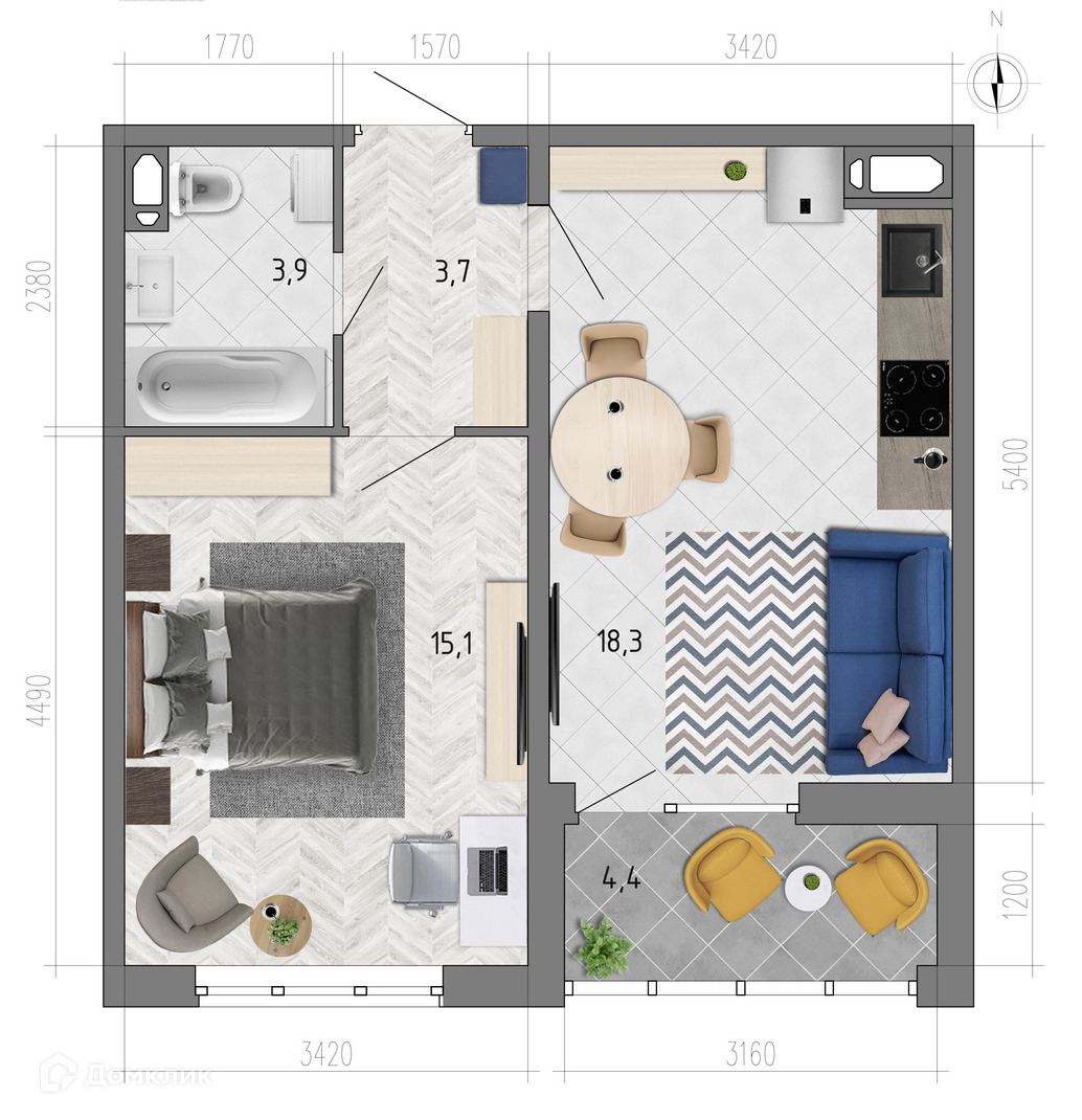 - ✅ Кухня: 18.3 м² — эргономичное пространство.