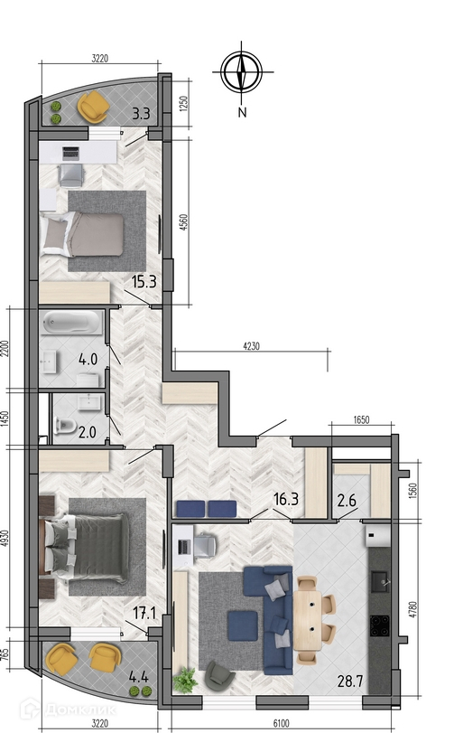 - ✅ Кухня: 28.7 м² — эргономичное пространство.