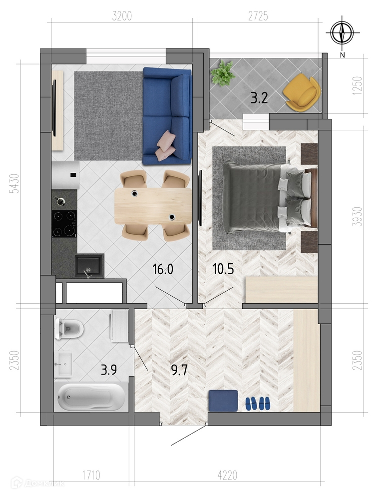 - ✅ Общая площадь: 41.7 м².