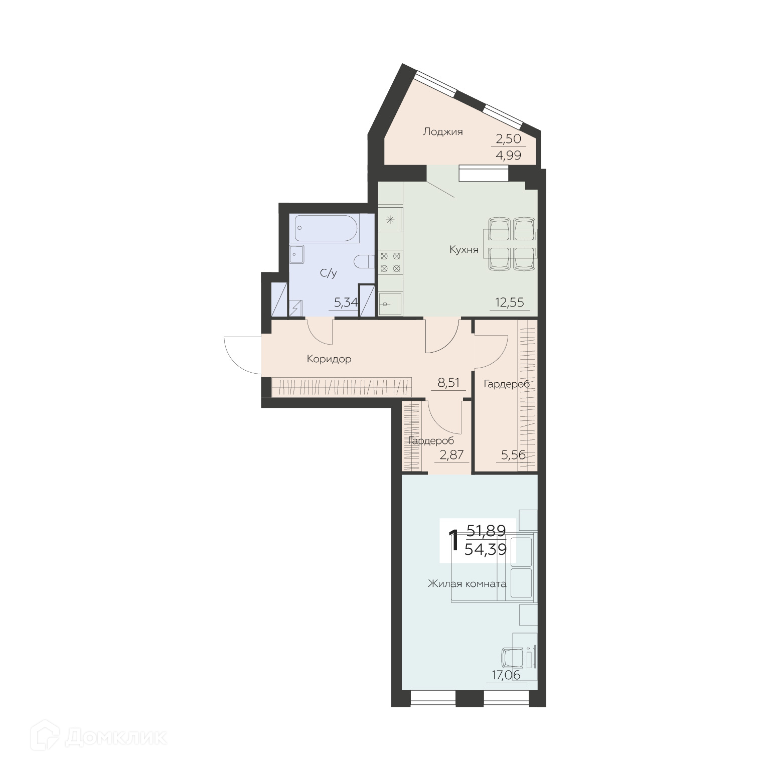 - Общая площадь: 54.39 м²