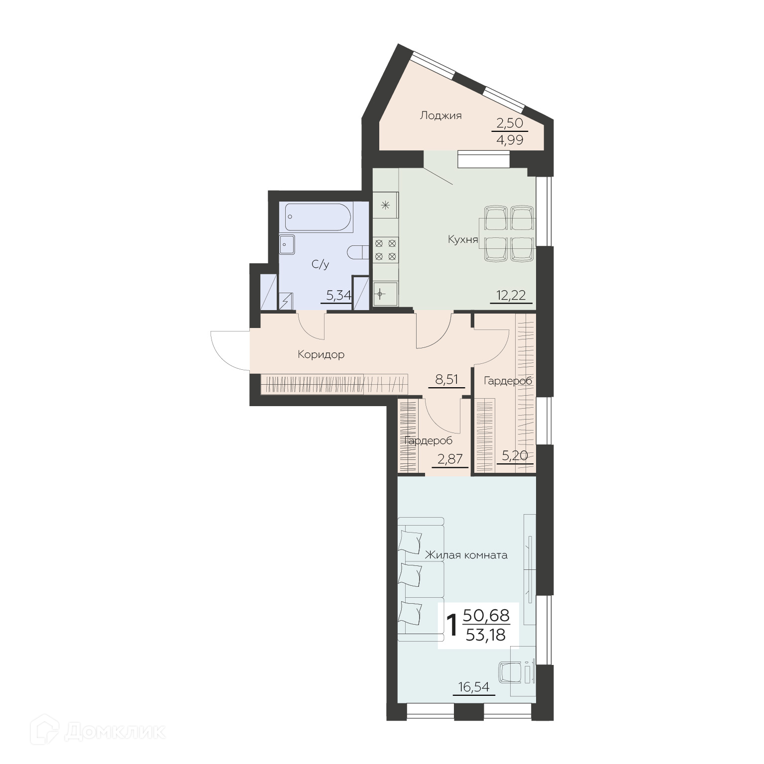 - Общая площадь: 53.18 м²