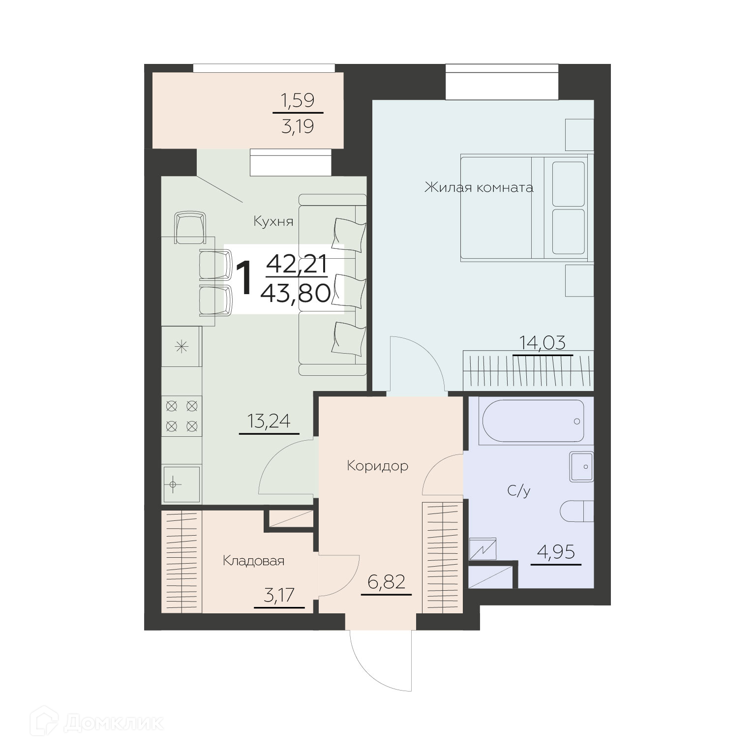 - Общая площадь: 43.8 м²