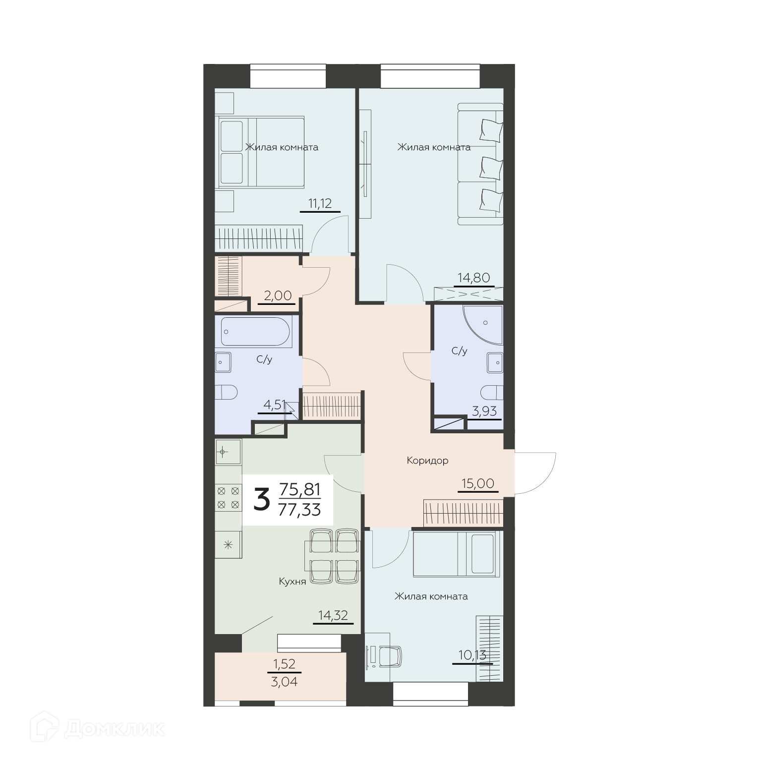 - Общая площадь: 77.33 м²