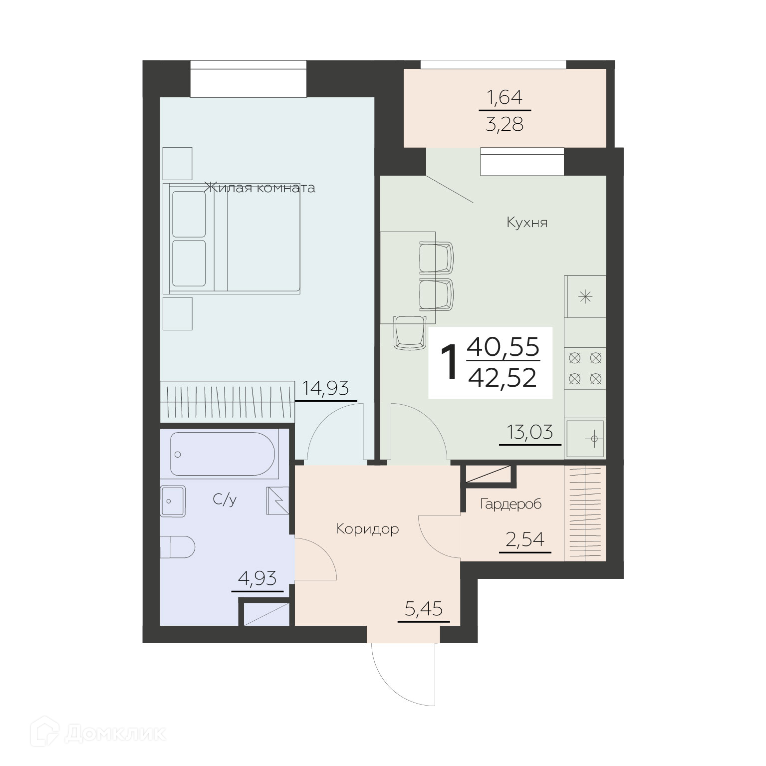 - Общая площадь: 42.52 м²