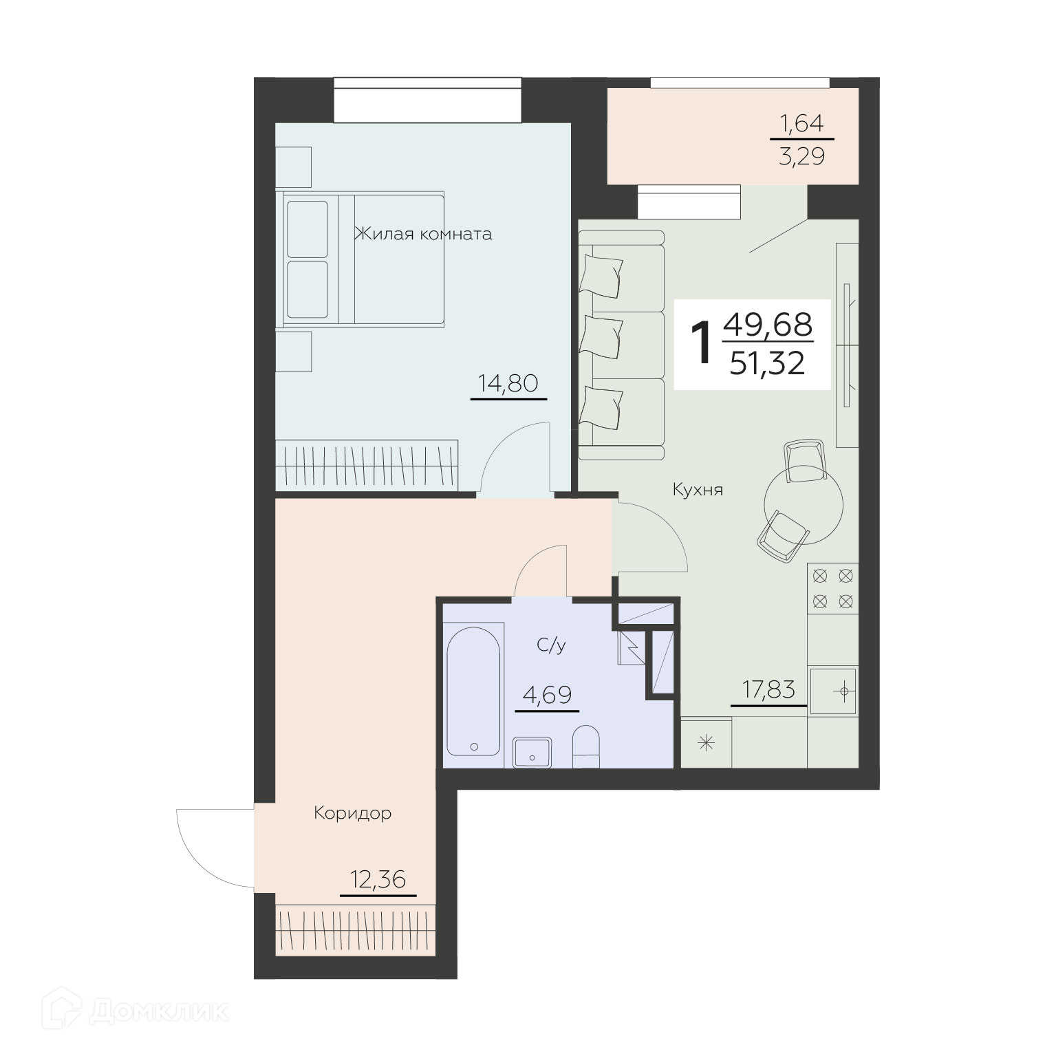 - Общая площадь: 51.32 м²