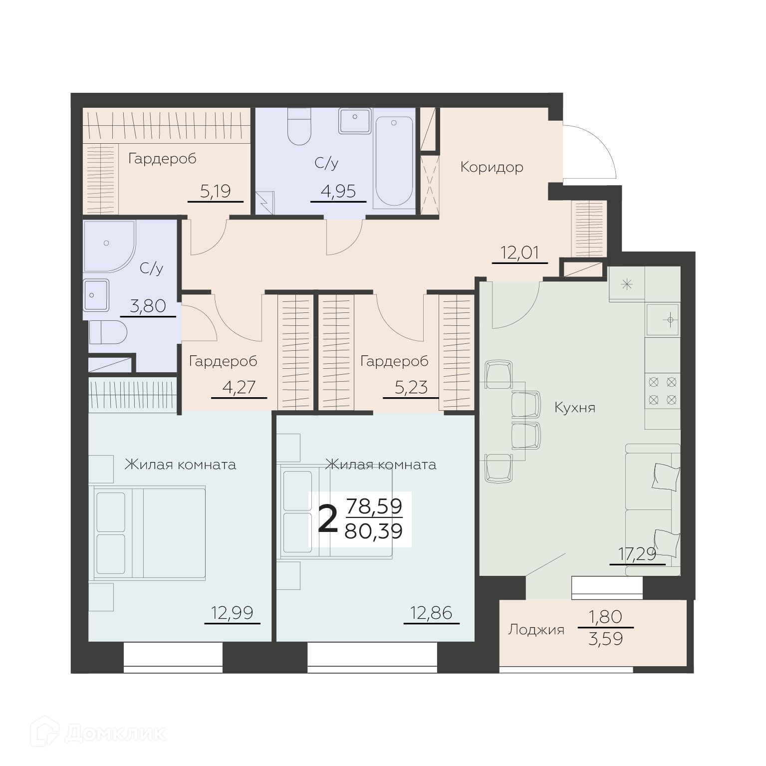 - Общая площадь: 80.39 м²