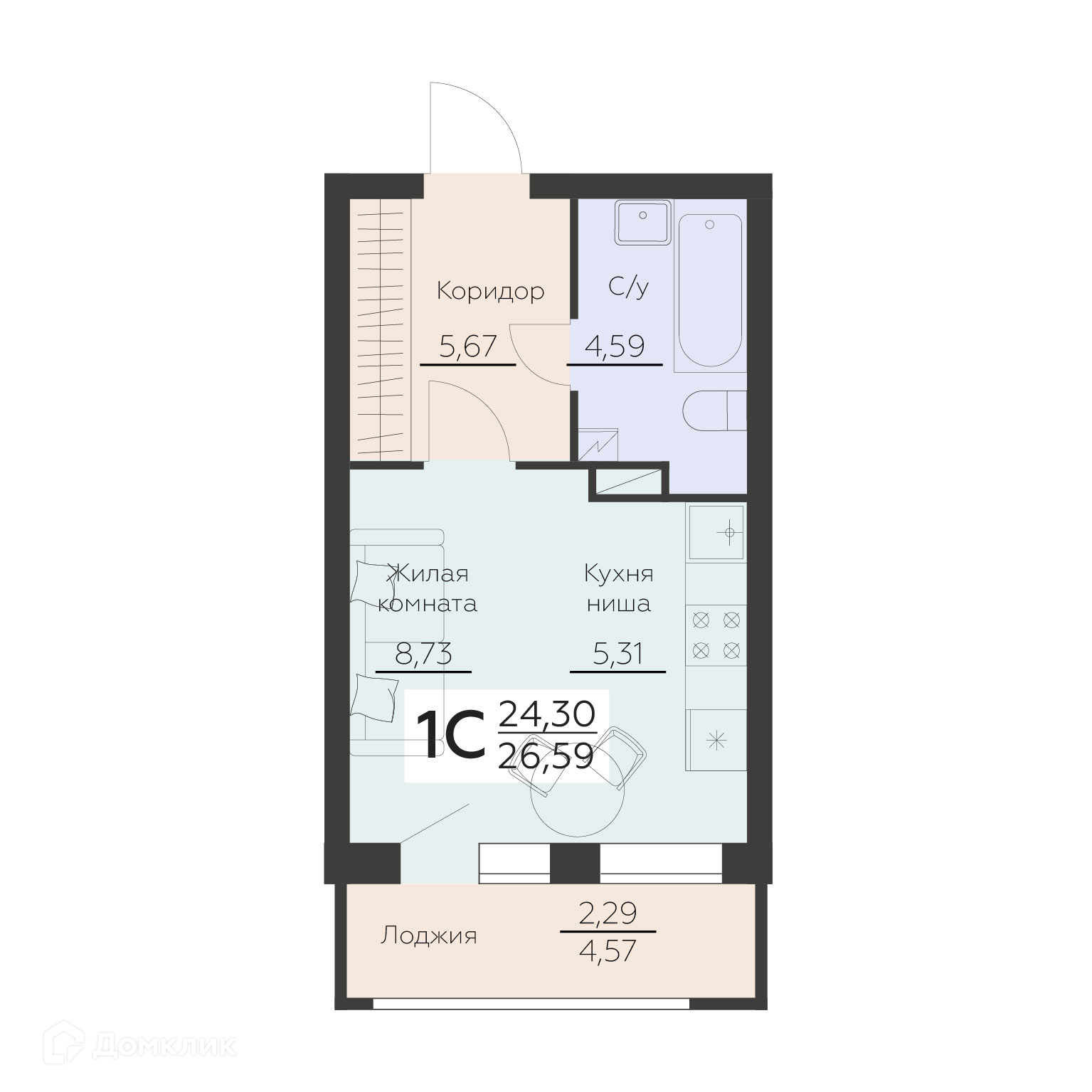 - Общая площадь: 26.59 м²