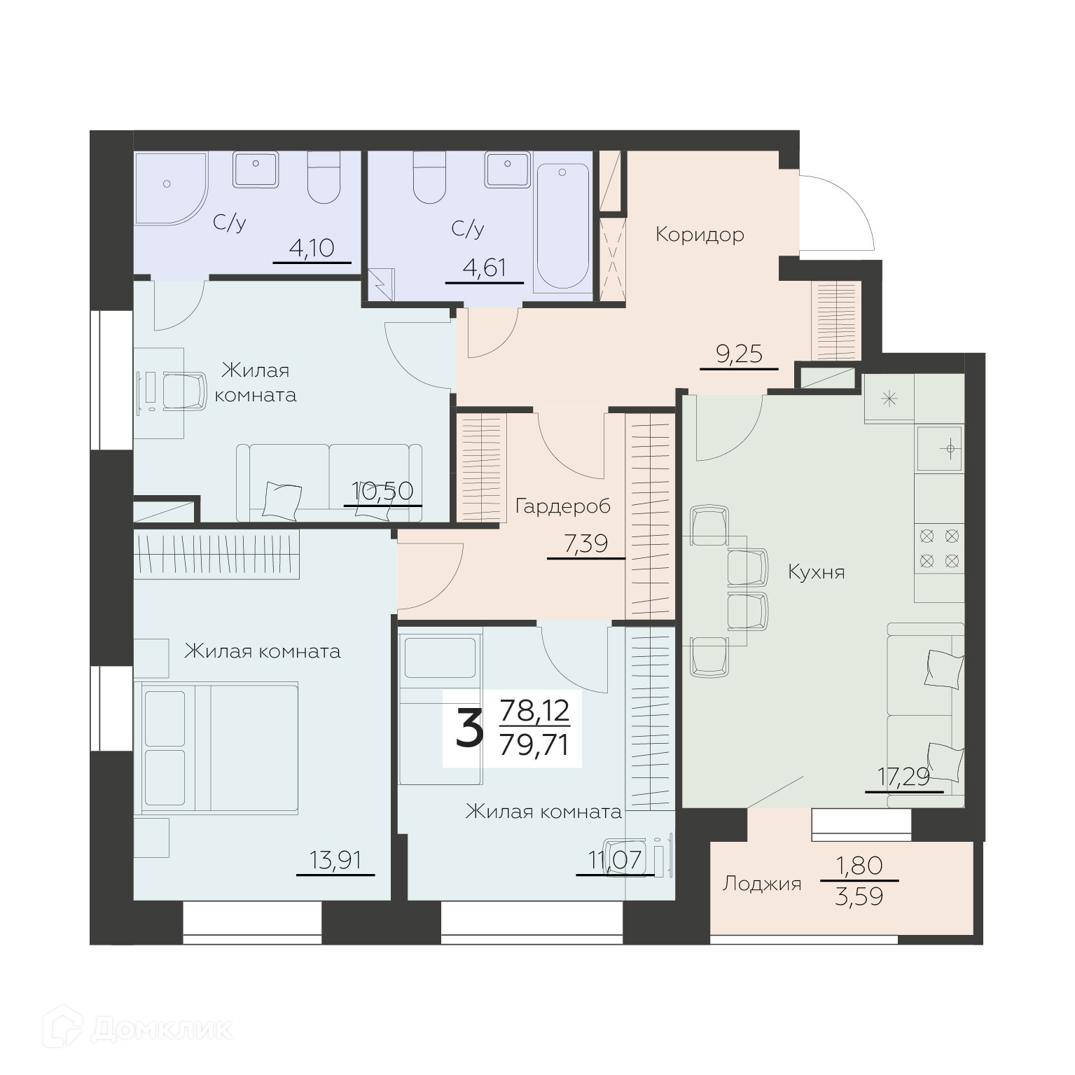 - Общая площадь: 79.71 м²