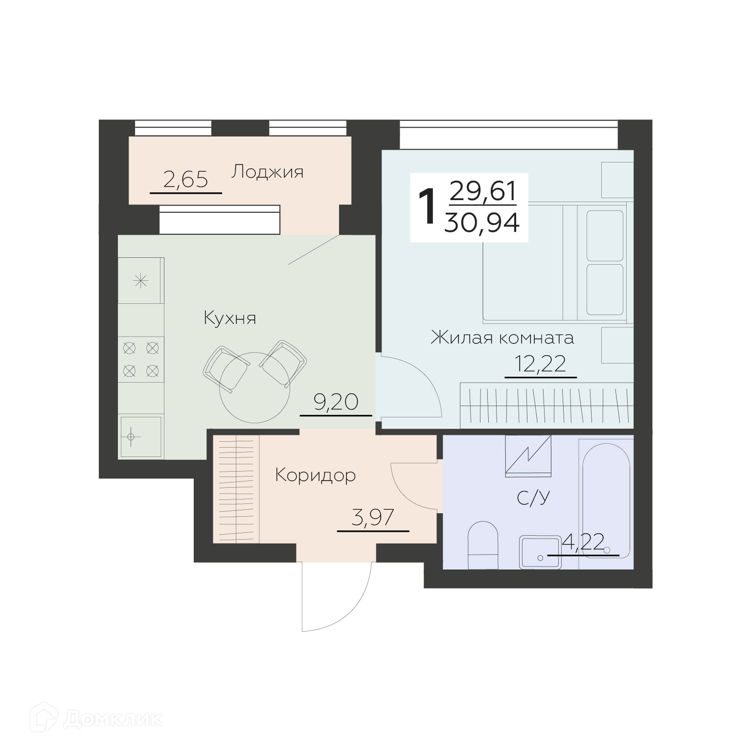 - Общая площадь: 30.94 м²