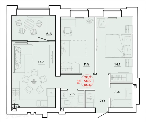 2 комн. квартира в Волгограде в ипотеку от 59 984 руб/месяц