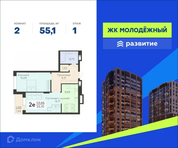 2 комн. квартира в ЖК "Молодежный"