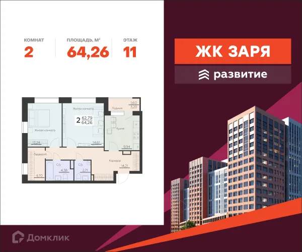 2 комн. квартира в Воронеже в ипотеку от 66 478 руб/месяц