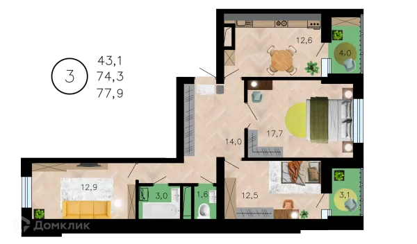 3 комн. квартира в Воронеже в ипотеку от 75 686 руб/месяц