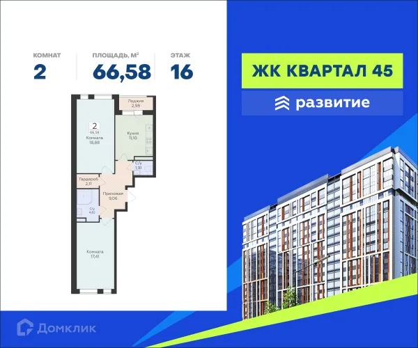 2 комн. квартира в Воронеже в ипотеку от 66 478 руб/месяц