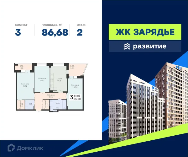 3 комн. квартира в Воронеже в ипотеку от 71 815 руб/месяц