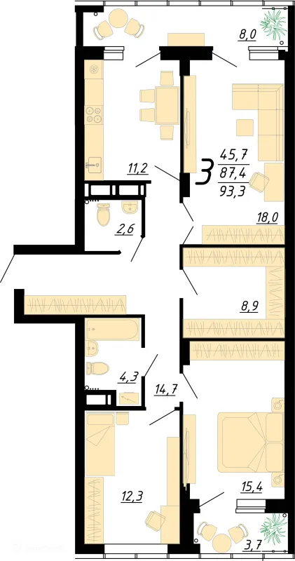 3 комн. квартира в Воронеже в ипотеку от 46 755 руб/месяц
