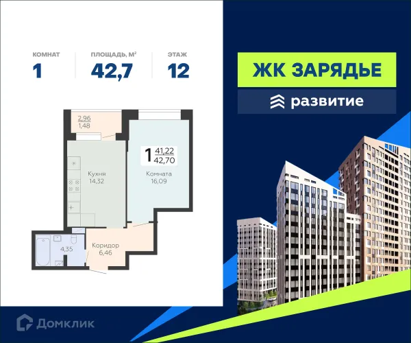 1 комн. квартира в Воронеже в ипотеку от 43 775 руб/месяц