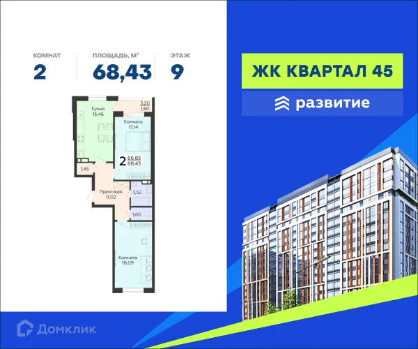 2 комн. квартира в Воронеже в ипотеку от 41 110 руб/месяц